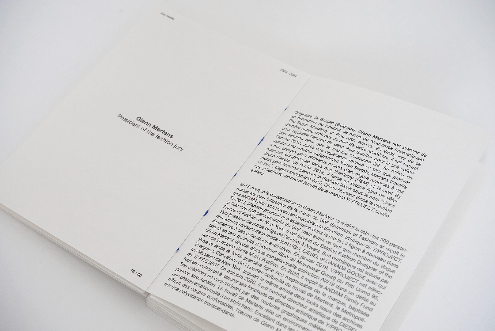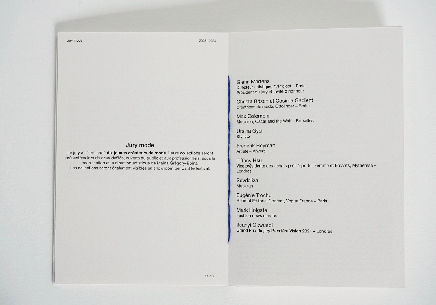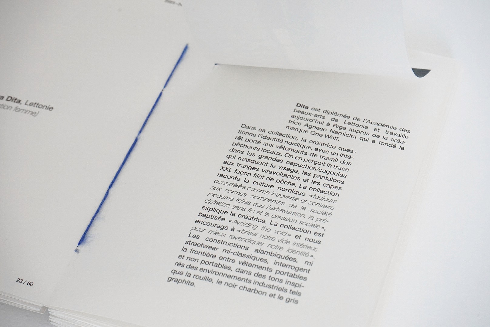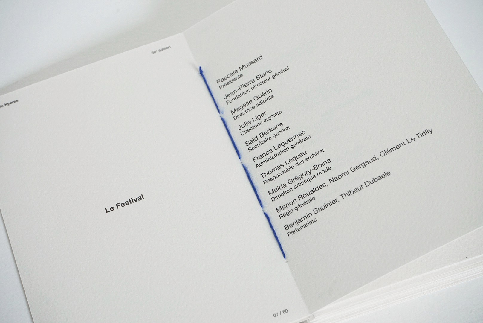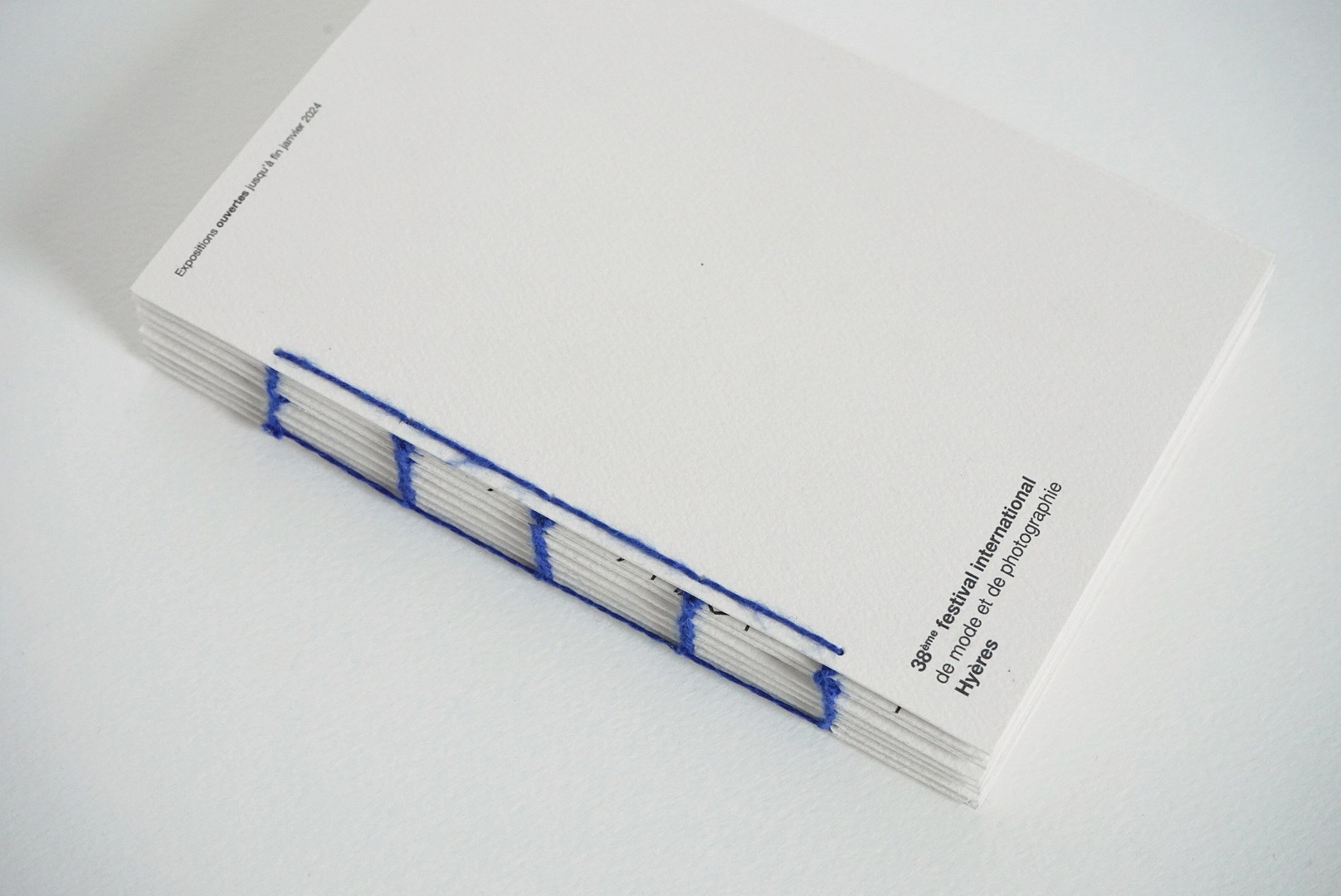 Dossier de presse pour le Festival International de Mode et de Photographie de Hyères. Ce dossier propose une double lecture : une première, minimaliste et épurée, et une seconde, dévoilant des textes explicatifs sous chaque photo pour découvrir les artistes présentés. L'utilisation de la broderie rappelle le processus de fabrication des vêtements.