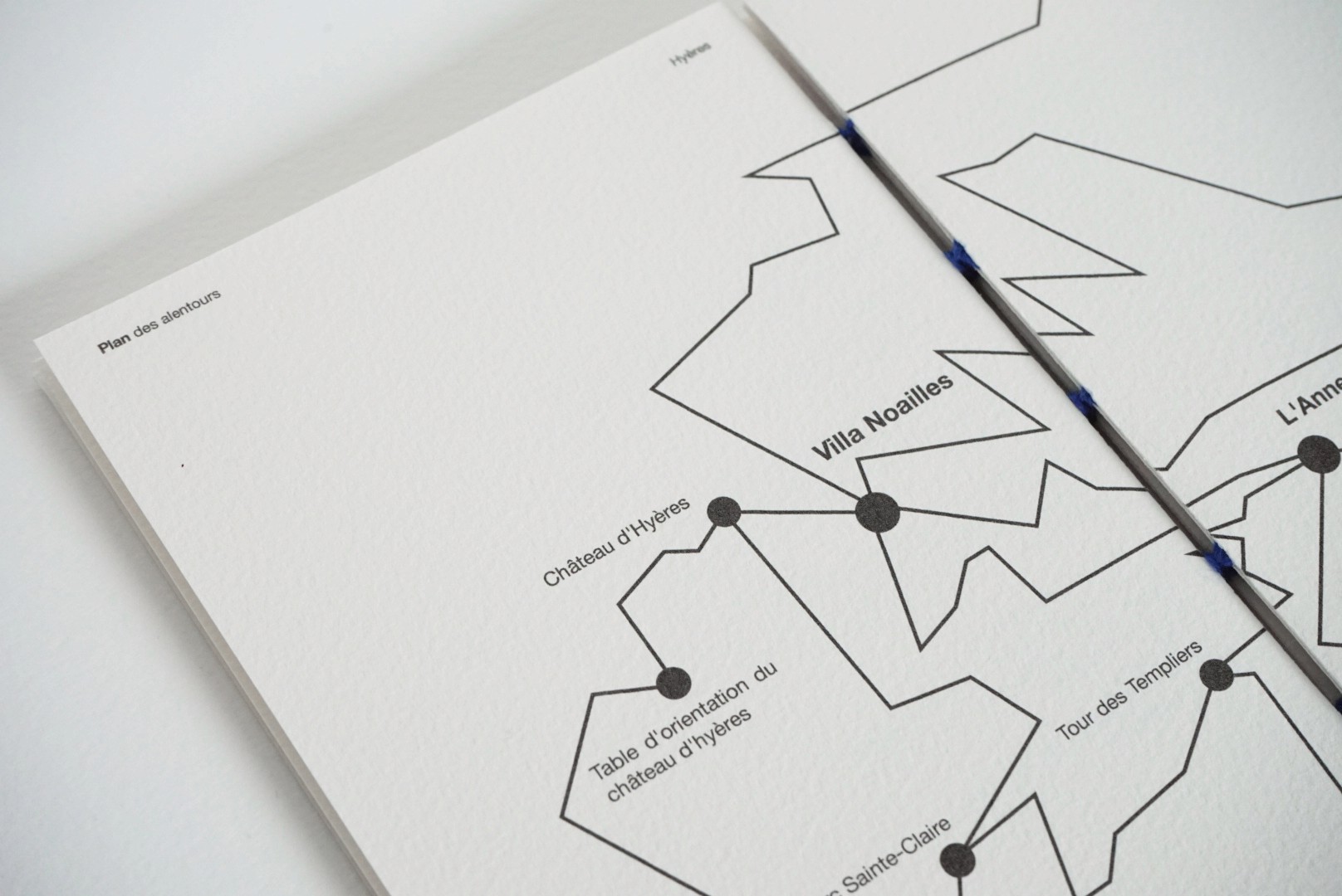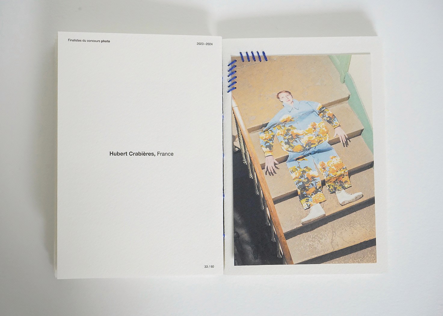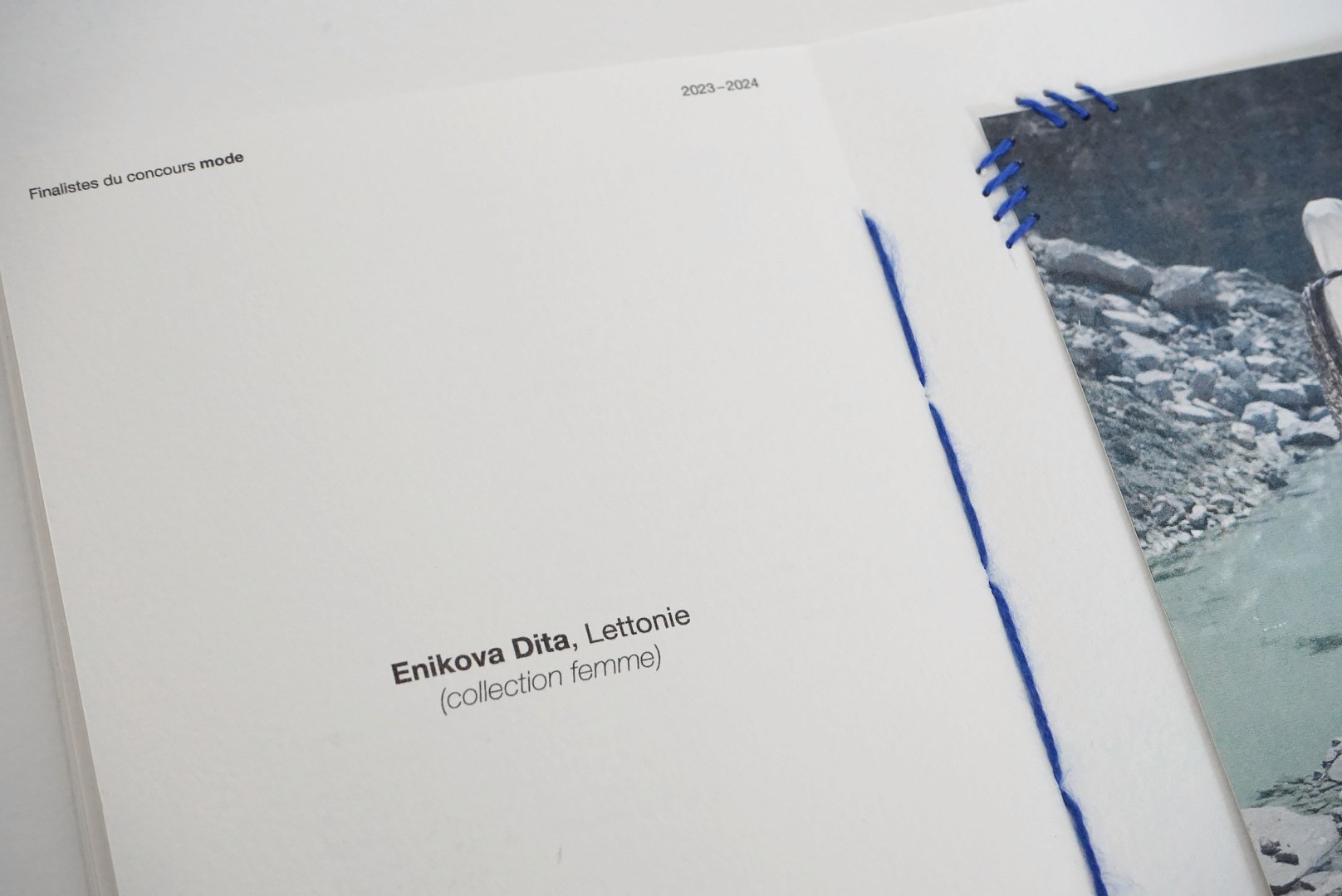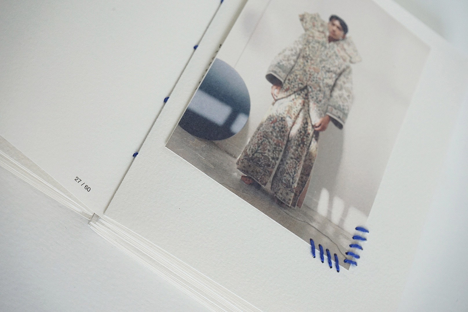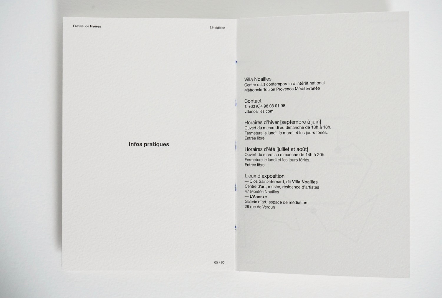 Dossier de presse pour le Festival International de Mode et de Photographie de Hyères. Ce dossier propose une double lecture : une première, minimaliste et épurée, et une seconde, dévoilant des textes explicatifs sous chaque photo pour découvrir les artistes présentés. L'utilisation de la broderie rappelle le processus de fabrication des vêtements.