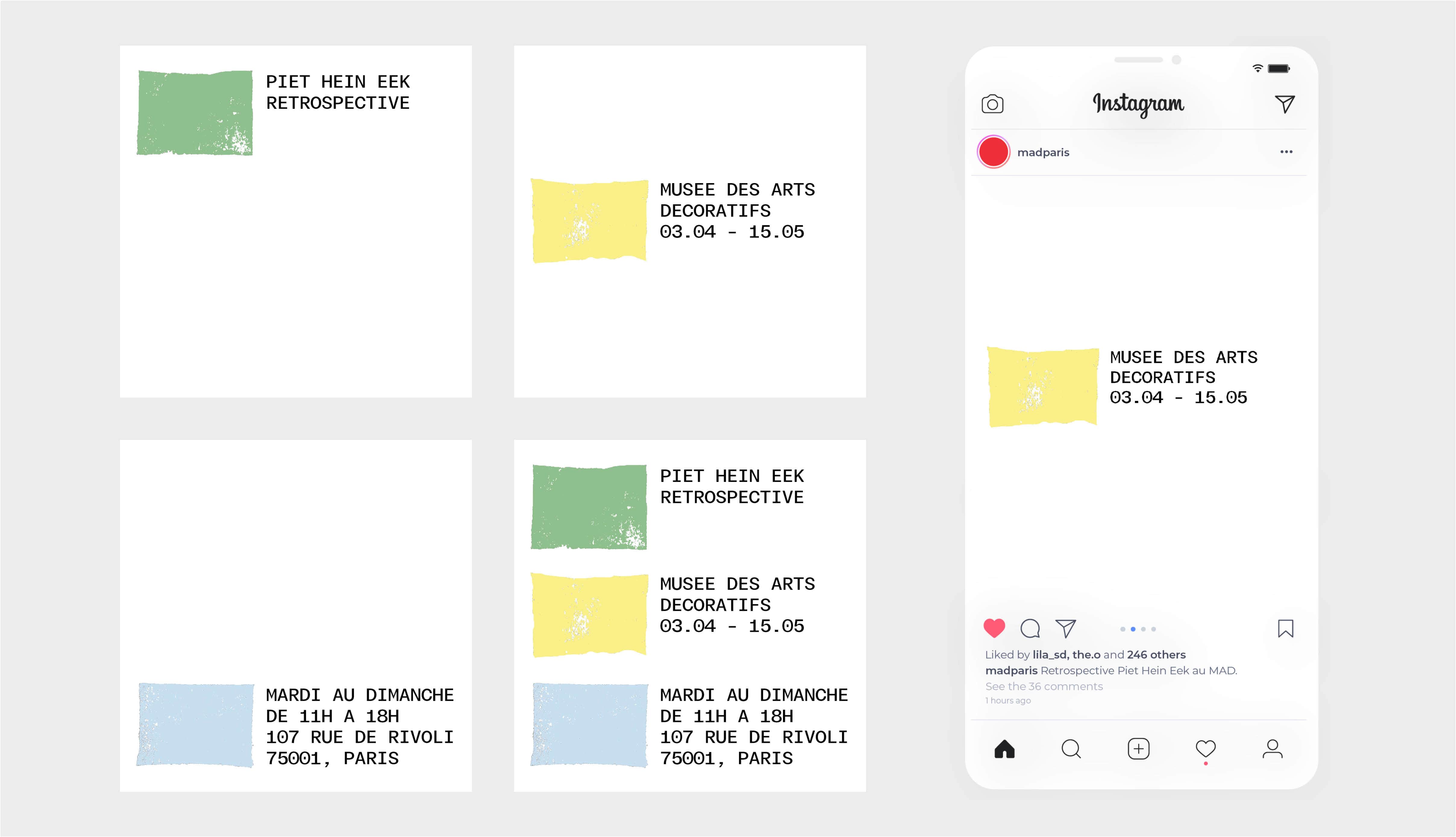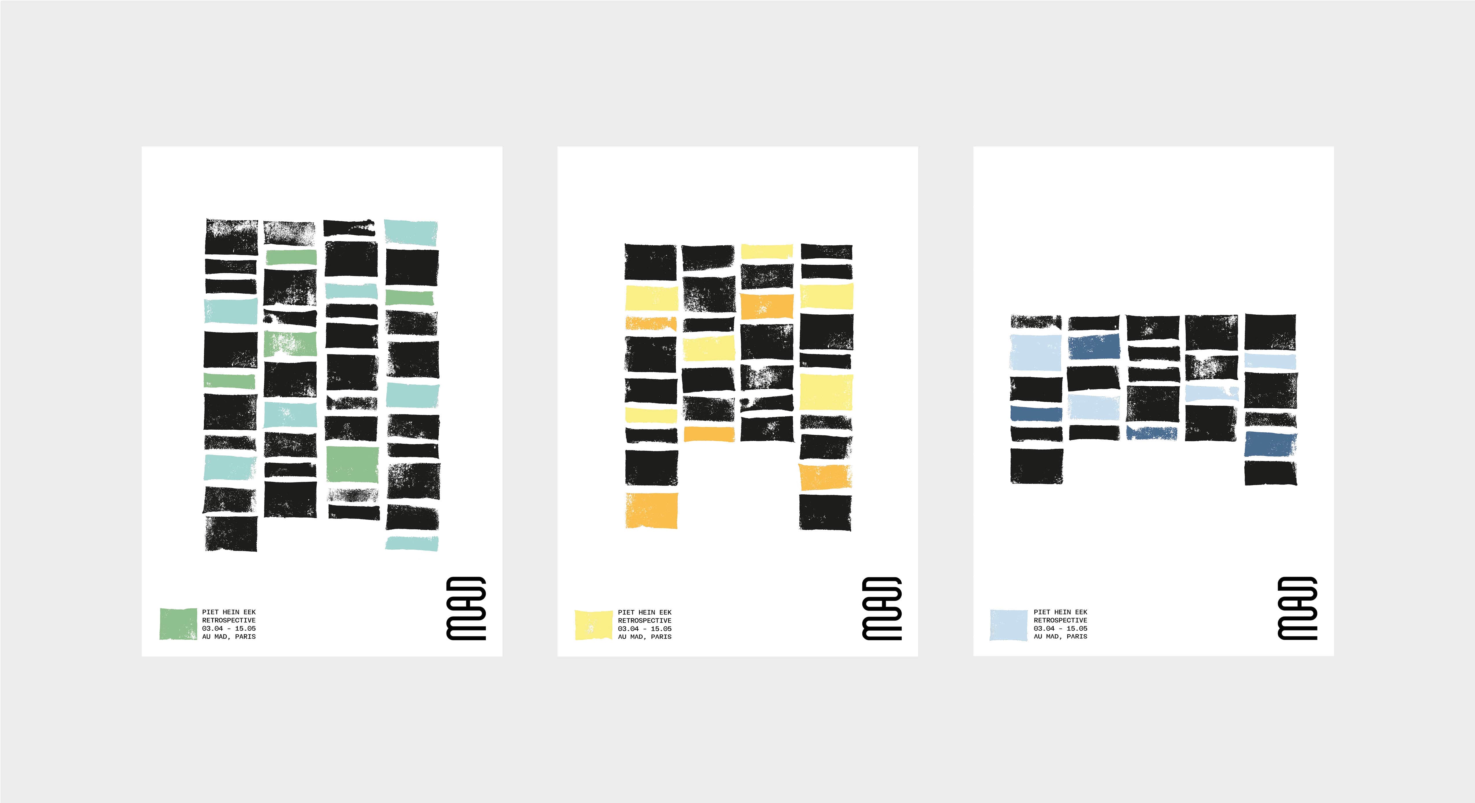 Campagne d’affichage et déclinaisons pour une rétrospective fictive sur le travail de Piet Hein Eek. Utilisation de la linogravure pour évoquer l’artisanat et la précision, caractéristiques du travail de ce designer néerlandais. Mon objectif étant de créer des motifs uniques par leur singularité et leurs imperfections ; construire un aléatoire minutieux.